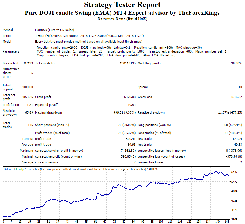 Test Results (Tick EURUSD 1H, 2003.01.01 - 2016.11.24) EMA filter disabled